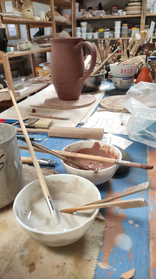 Hay dos máquinas de torno y dos estanterías; una repleta de utensilios de barro, otra con esmaltes, pinceles, paletas de colores, moldes, rodillos, espátulas, estecas, desvastadores, hilos de nailon y hasta una pistola de calor.
